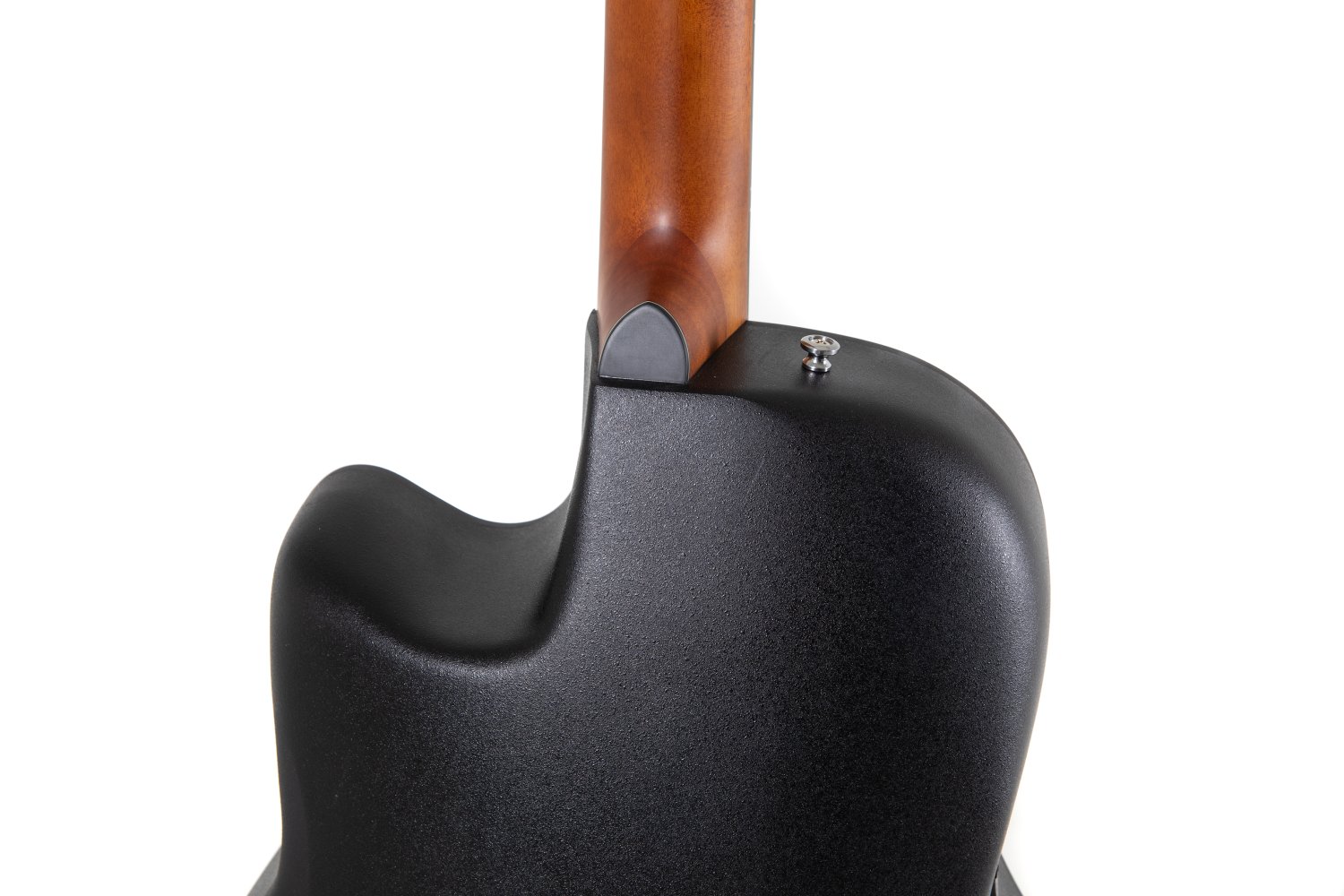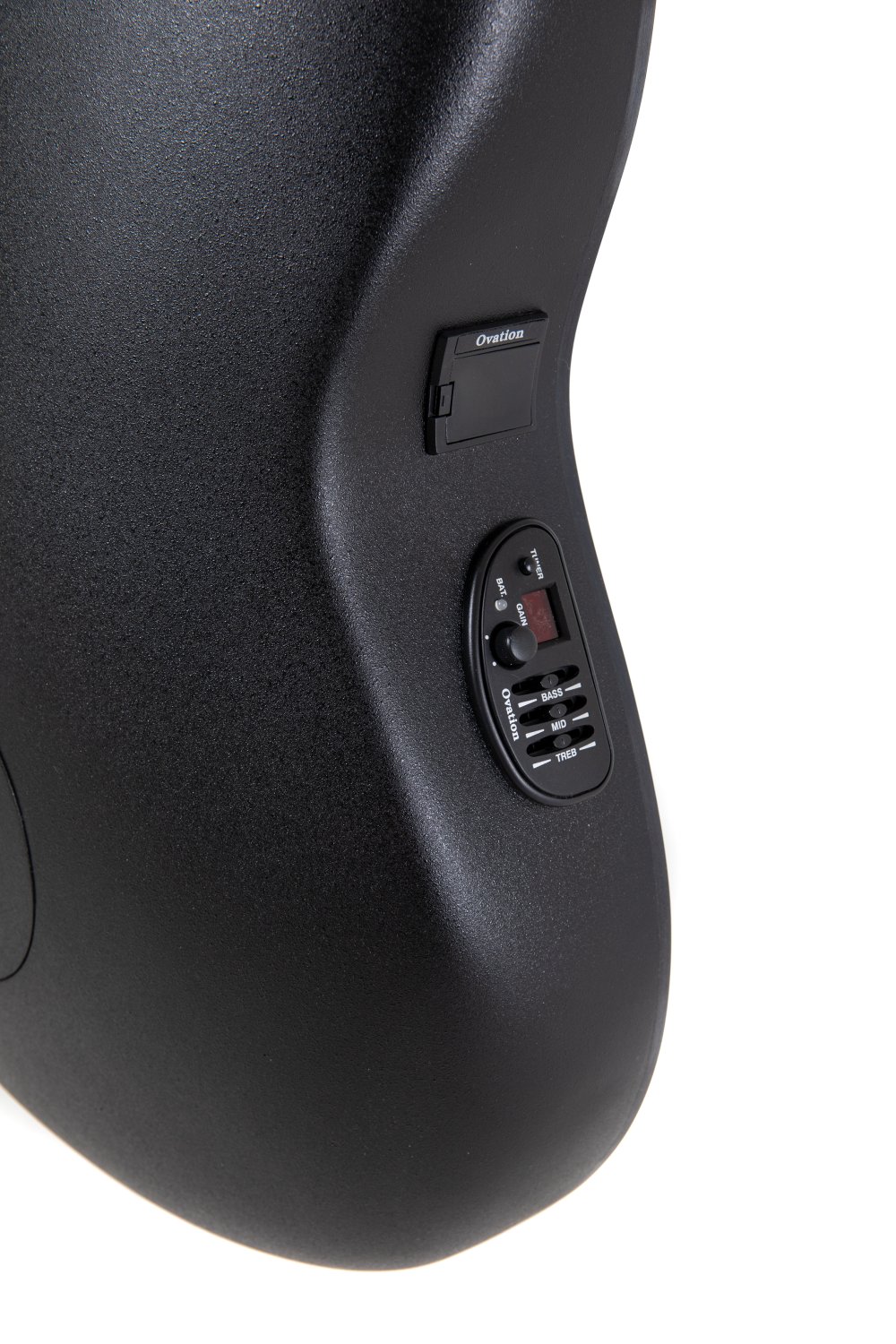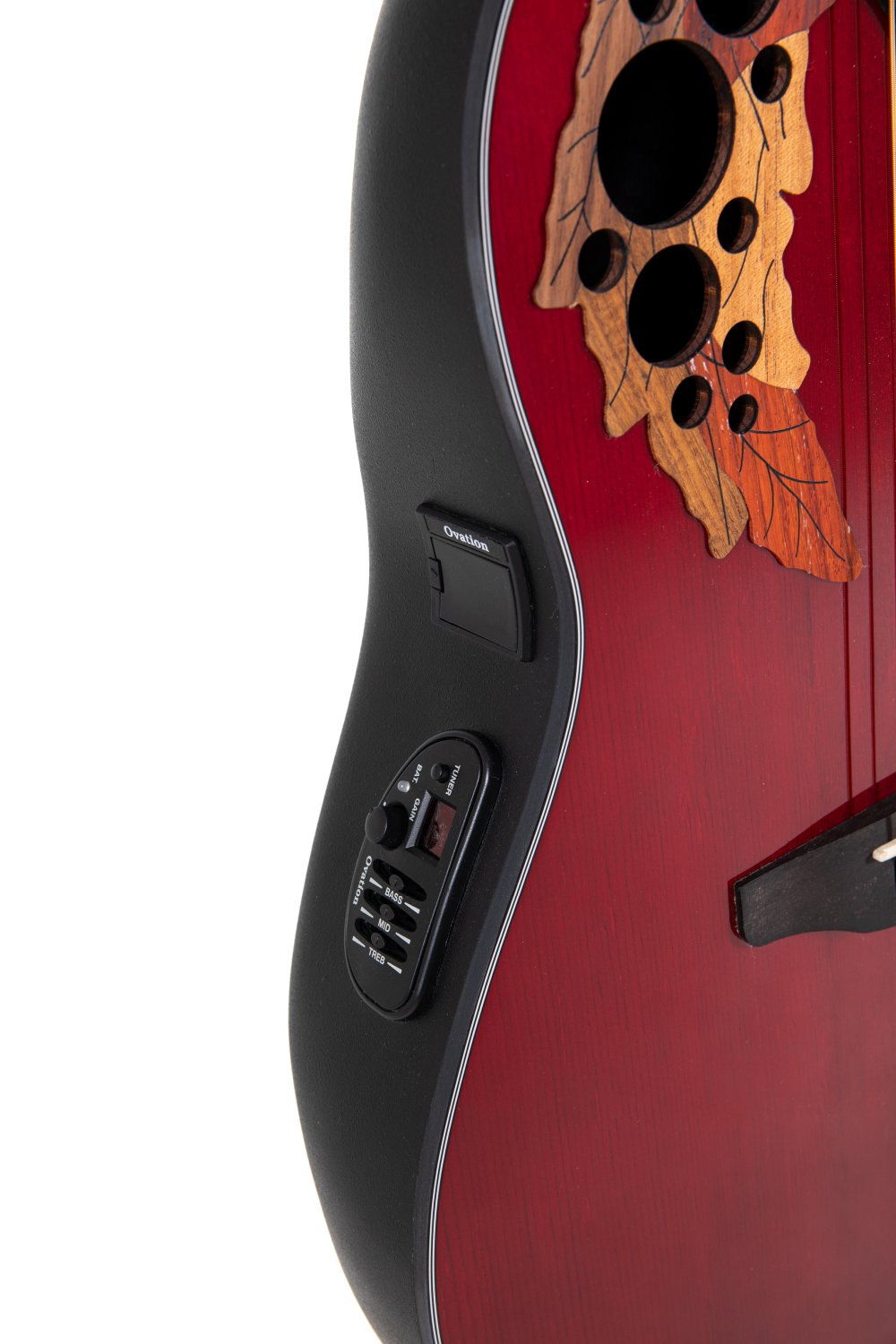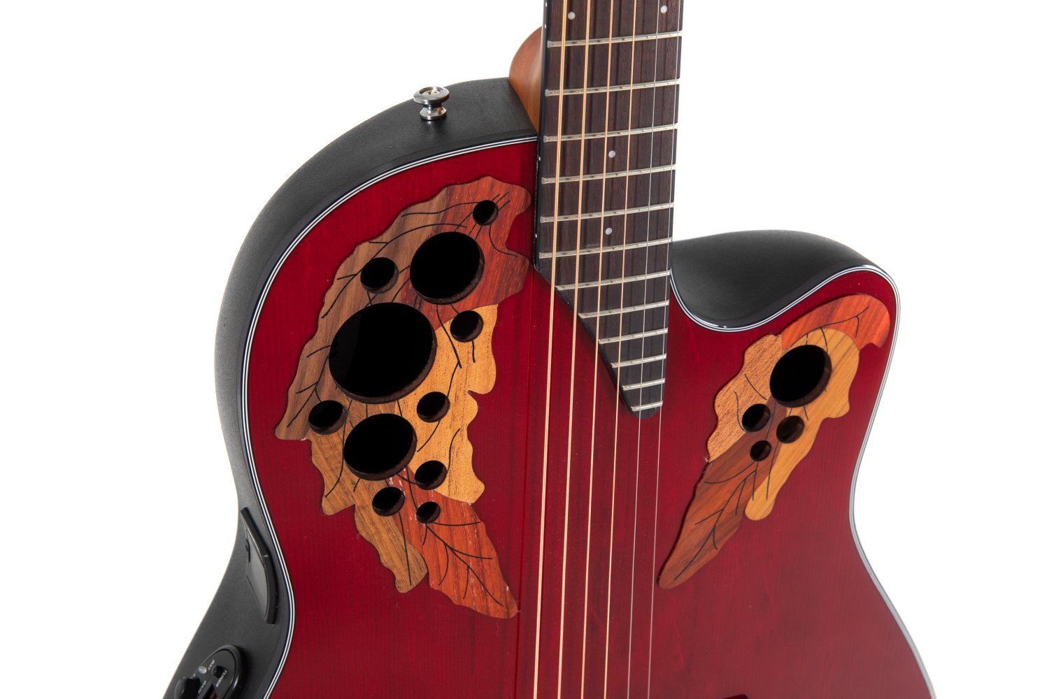 Solid Spruce top scalloped, quarter sawn X-bracingMulti sound holeMid-depth Lyrachord® bodyNato neck, fingerboard (with binding) and bridge OvangkolScale length 642 mm, nut width 42,8 mmMulti hardwood epaulettesPearloid dot inlaysBlack binding, multi-ply purflingsDie-cast Ovation machine heads, chromeOvation slimline pickup, OP4BT preamp with tunerItem Code: CE44-RR