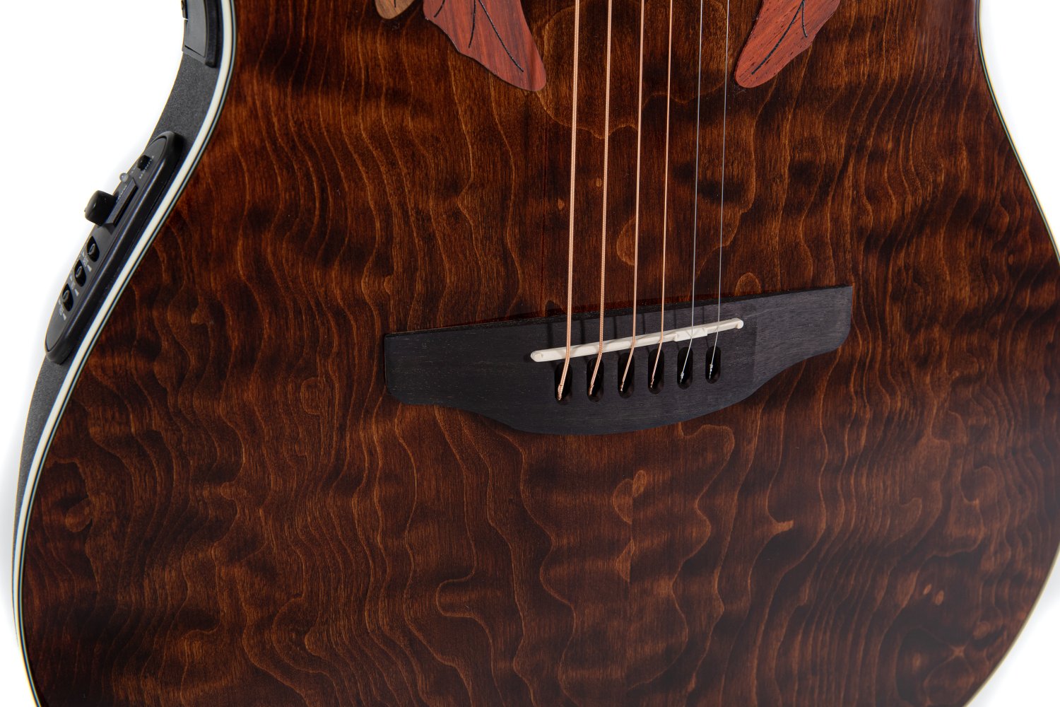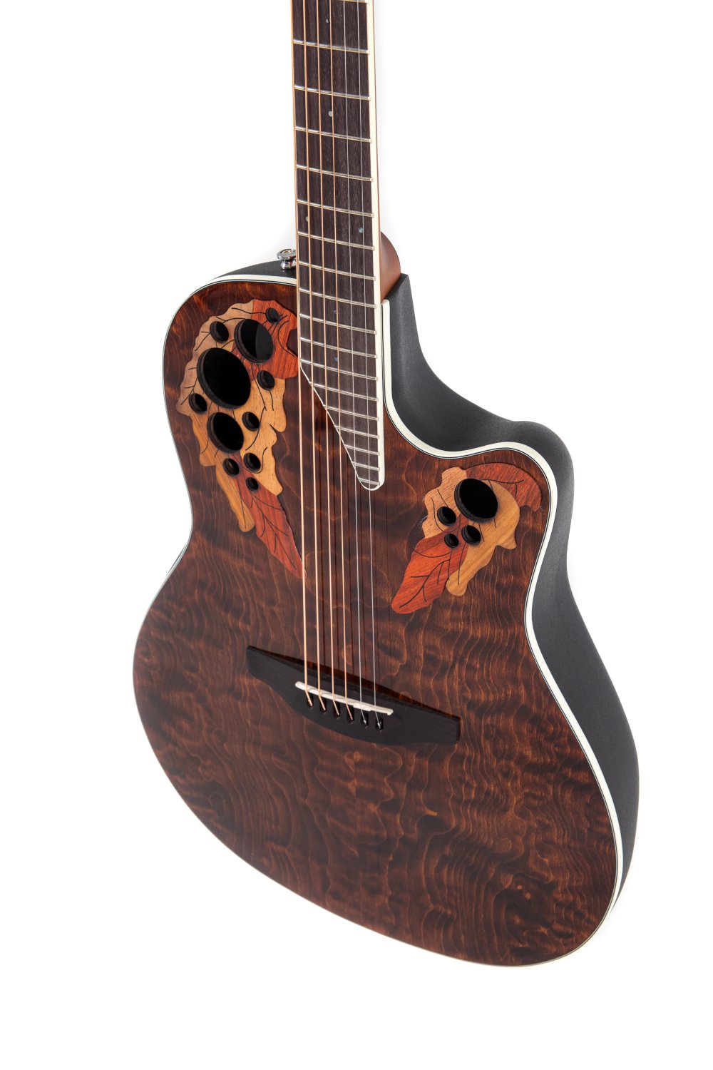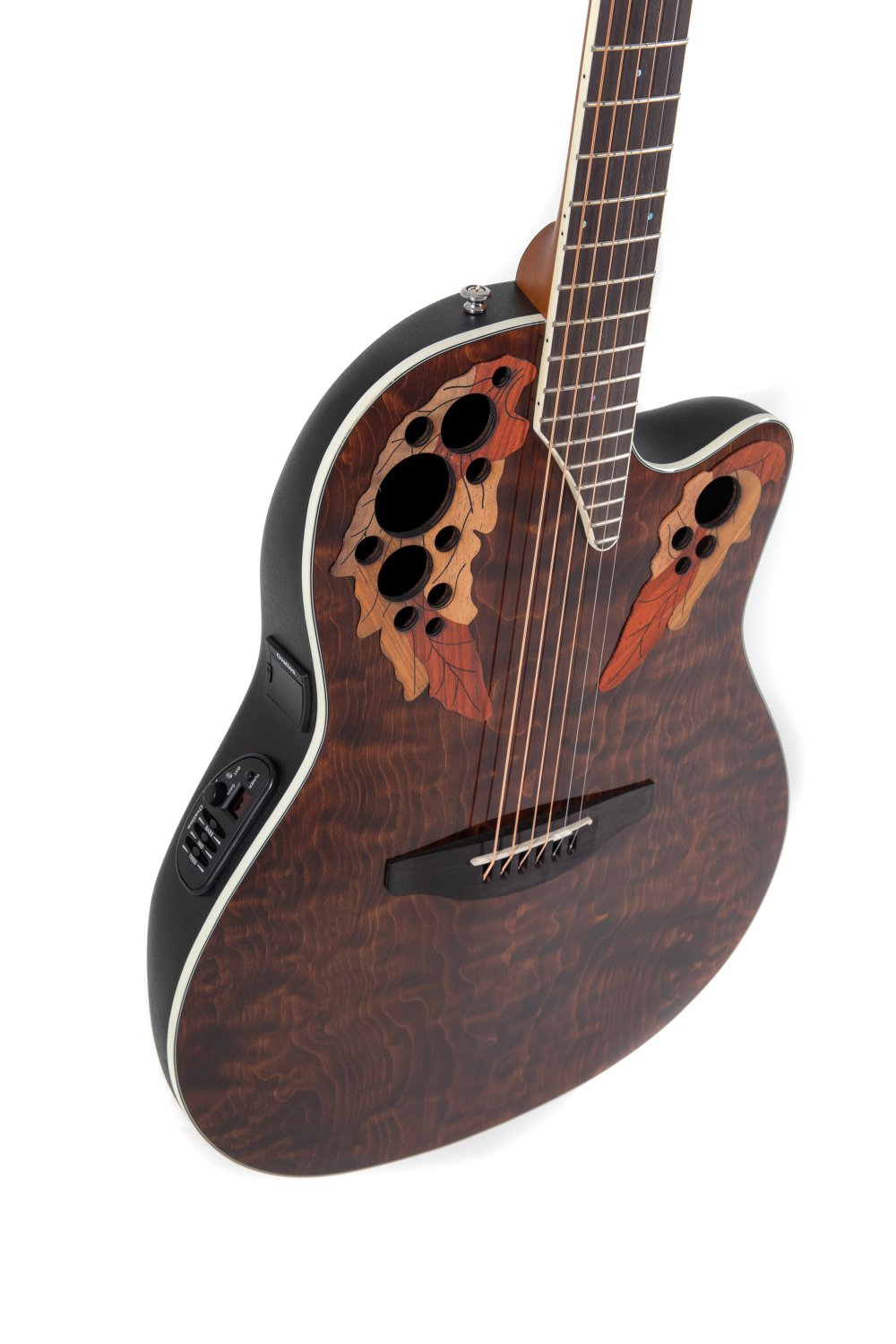 Not subject to CITESSelected figured top scalloped, quarter sawn X-bracingMulti sound holeSuper shallow Lyrachord® bodyNato neck, Ovangkol fingerboard and bridgeScale length 642 mm, nut width 42,8 mmMulti hardwood epaulettesAbalone-Dot-InlaysIvory white binding, multi-ply purflingDie-cast Ovation machine heads, chromeOvation slimline pickup, OP4BT preamp with tunerItem Code: CE48P-TGE