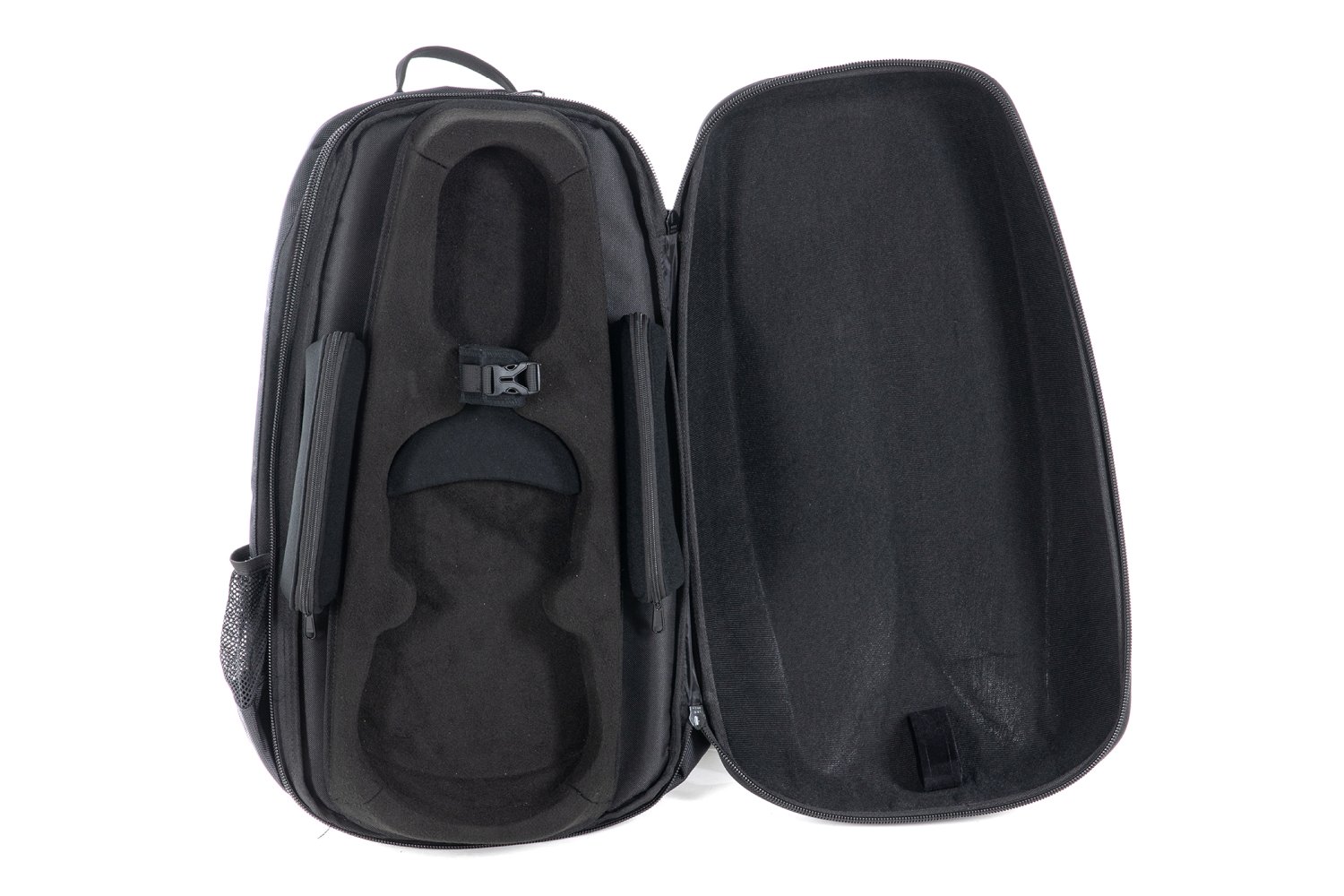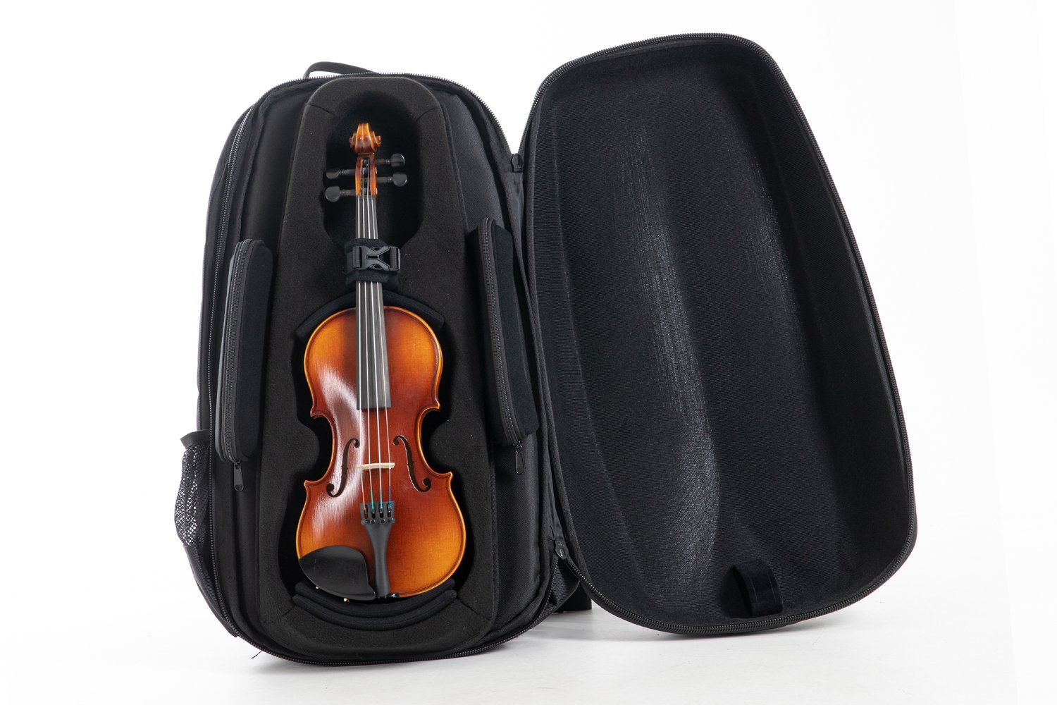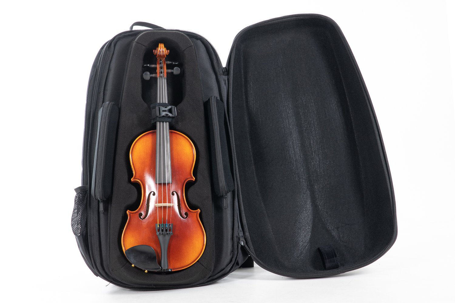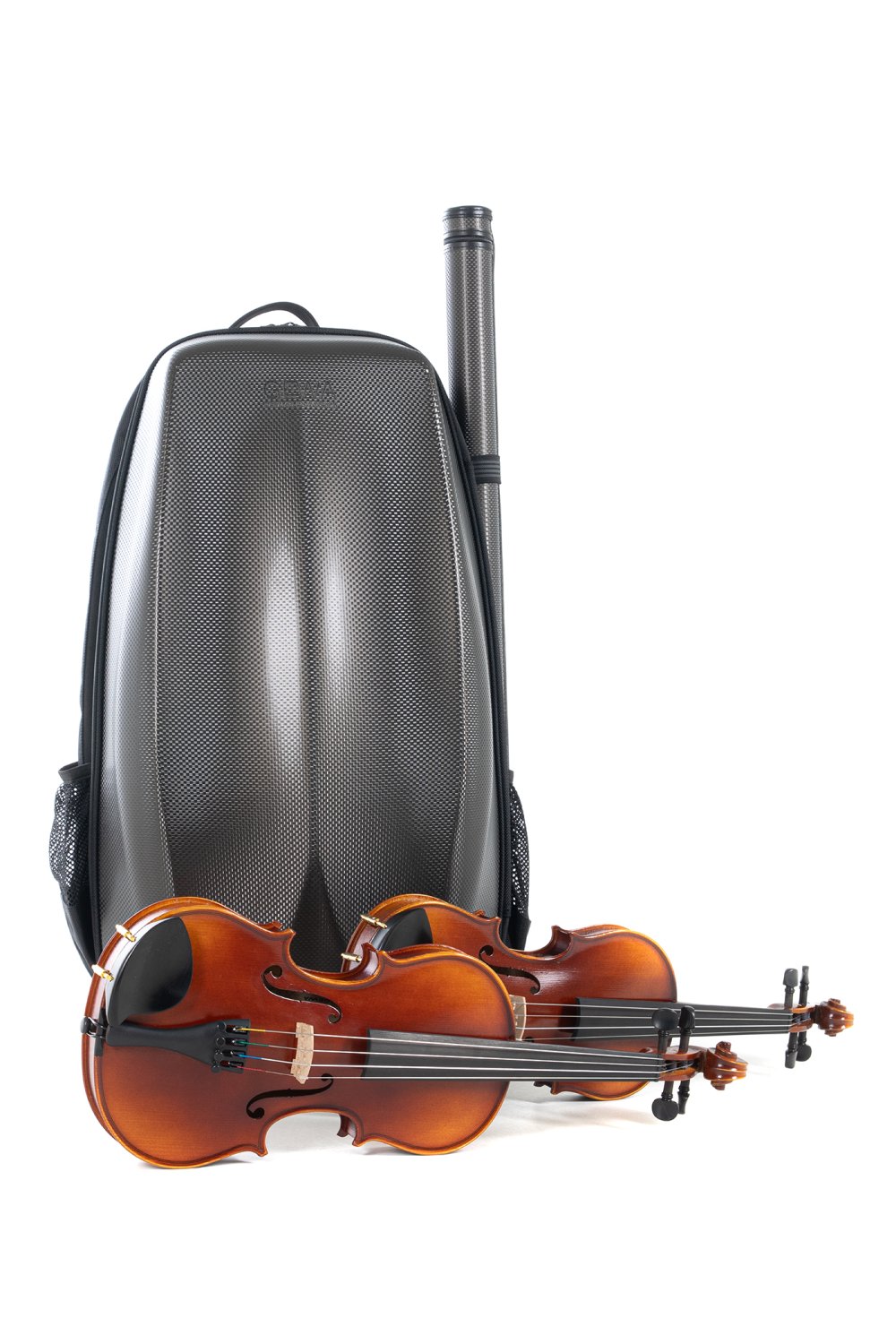 Ergonomically shaped for maximum comfort during commute Great for travel lightweightPolycarbonate exteriorModern minimalist designSeparate detachable bow caseLuxiriously spacious accessory compartments for everything from strings, taplet, to passportPadded suspension systemInstrument bed made of robust & semi-soft high-quality polyurethane foam Padded, removable backpack straps Subway handleSide mesh pockets Weight 4/4 – 3/4 size 5.9lbs (incl. bow case)Weight 1/2 - 1/4 size 5lbs (incl. bow case)13" x 24.75" (26 w/bow case) x 7.5"