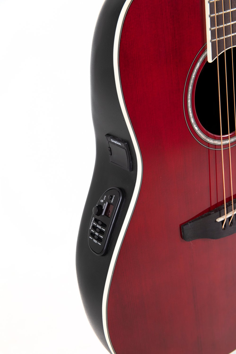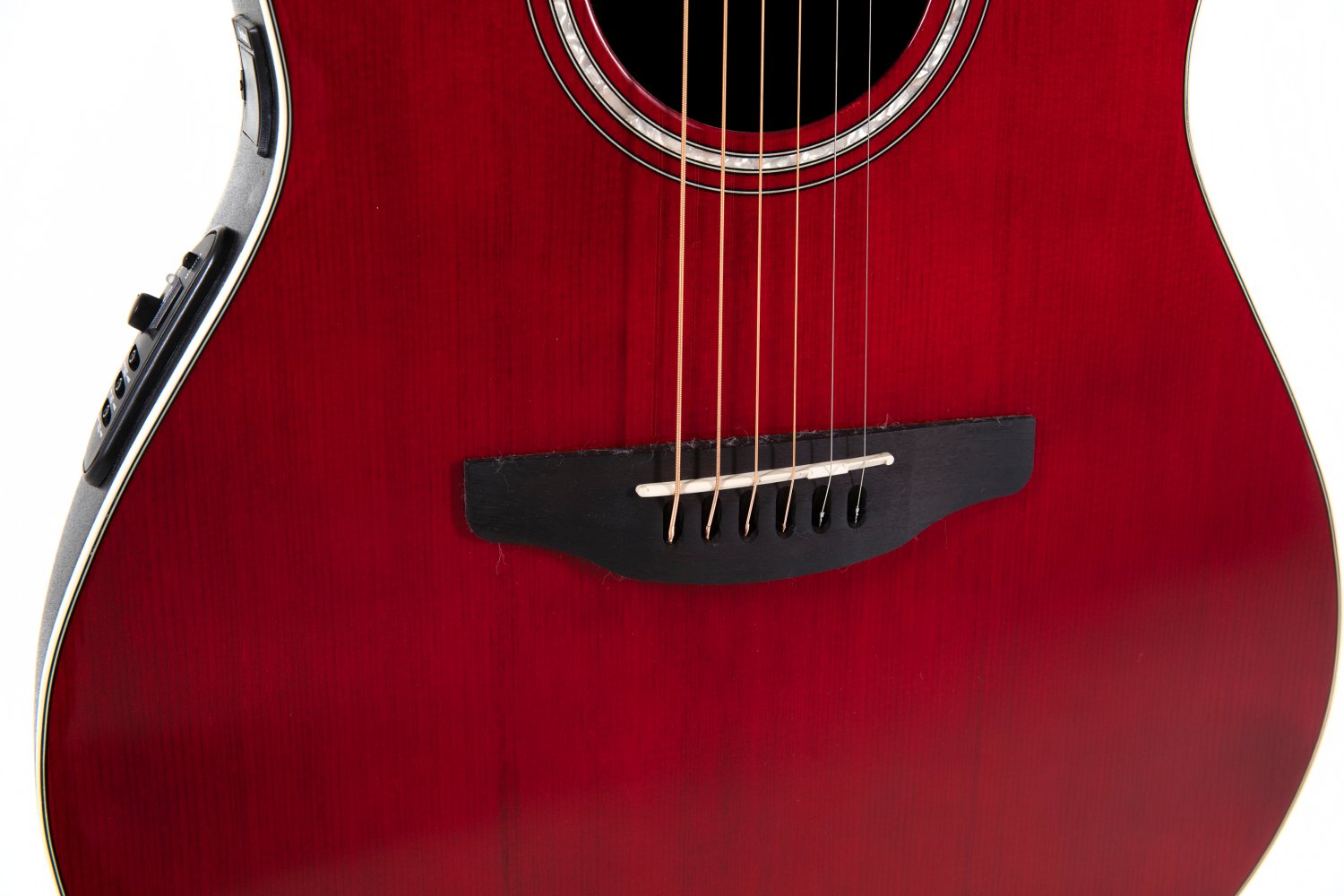 Solid spruce top; scalloped, quartersawn X-Bracing CS Round Soundole = Center soundhole Mid-depth Lyrachord® Body Nato neck, fingerboard and bridge Ovangkol Scale 642 mm, nut width 42,8 mm Pearloid-Rosette and Dot-Inlays Ivory white binding, multi-ply purflings Die-cast Ovation machine heads, chrome Ovation Slimline Pickup, OP4BT Preamp with tuner Item Code: CS24-RR