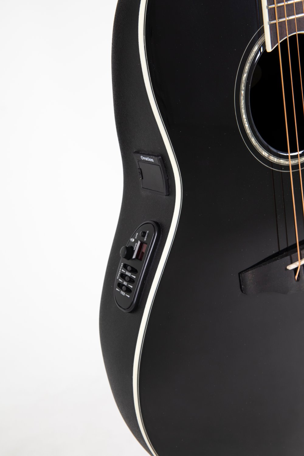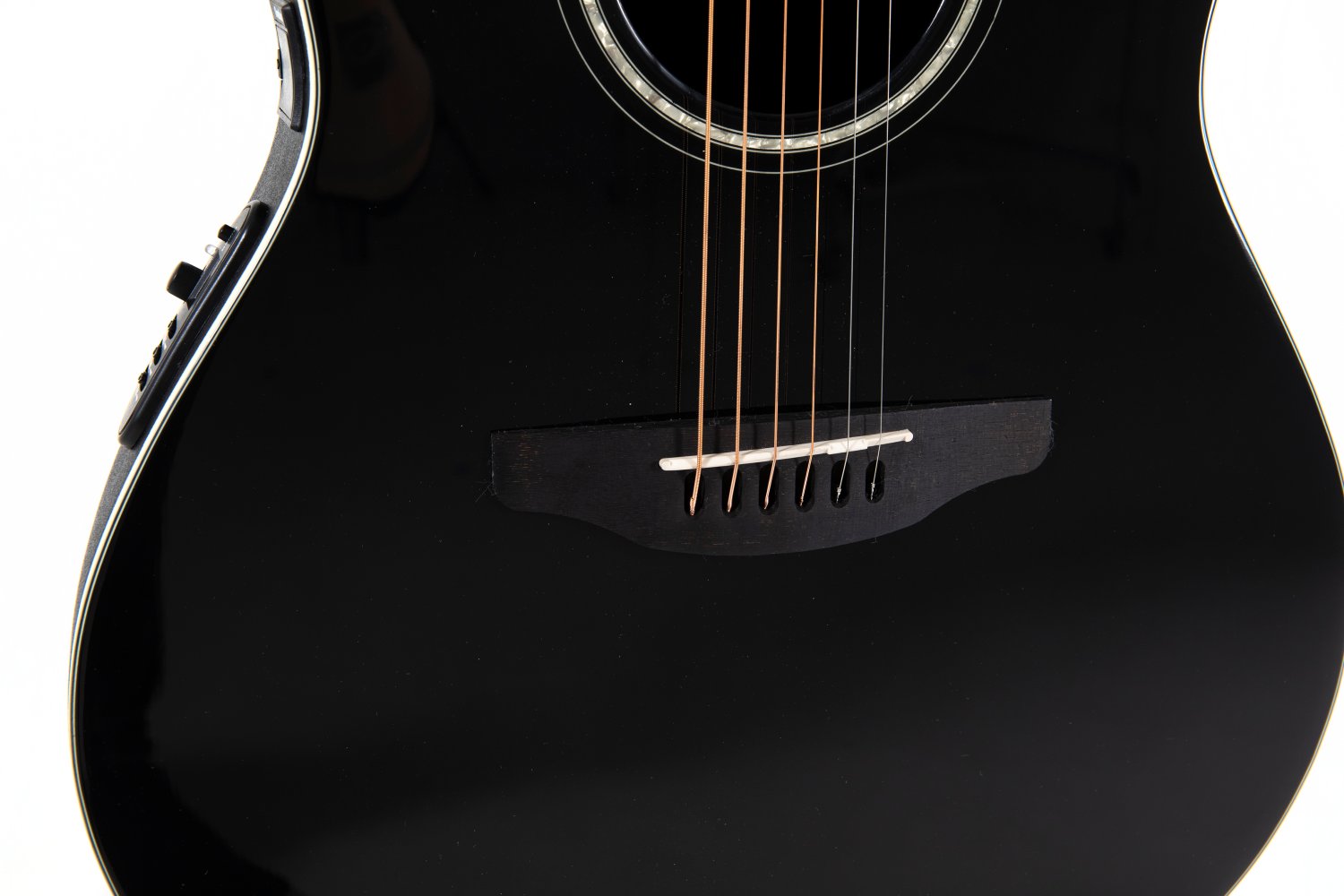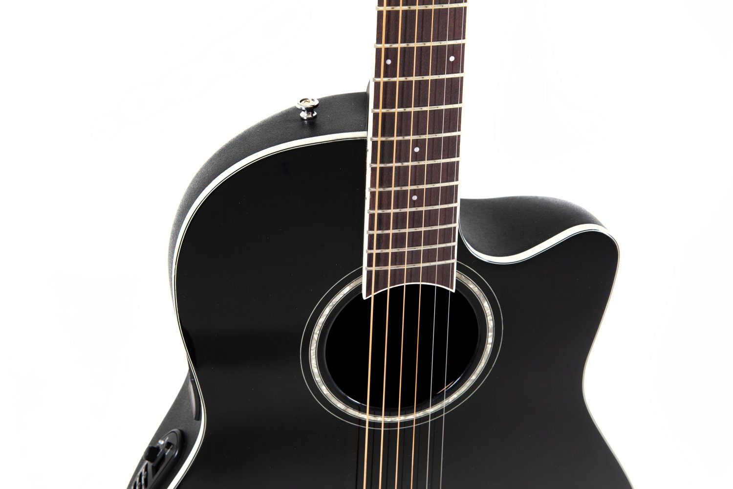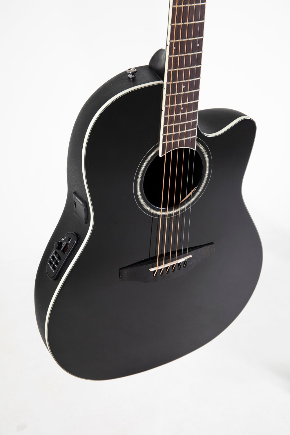 Solid spruce top; scalloped, quartersawn X-Bracing CS Round Soundole = Center soundhole Mid-depth Lyrachord® Body Nato neck, fingerboard and bridge Ovangkol Scale 642 mm, nut width 42,8 mm Pearloid-Rosette and Dot-Inlays Ivory white binding, multi-ply purflings Die-cast Ovation machine heads, chrome Ovation Slimline Pickup, OP4BT Preamp with tuner Item Code: CS24-5
