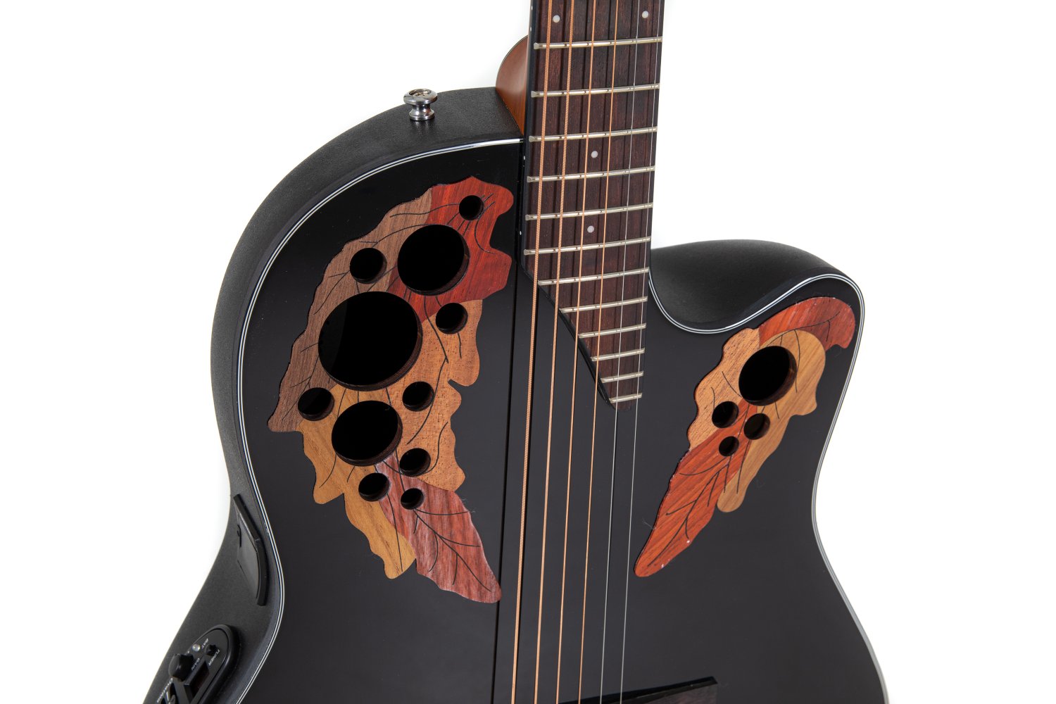 Solid Spruce top scalloped, quarter sawn X-bracingMulti sound holeMid-depth Lyrachord® bodyNato neck, fingerboard (with binding) and bridge OvangkolScale length 642 mm, nut width 42,8 mmMulti hardwood epaulettesPearloid dot inlaysBlack binding, multi-ply purflingsDie-cast Ovation machine heads, chromeOvation slimline pickup, OP4BT preamp with tunerItem Code: CE44-5