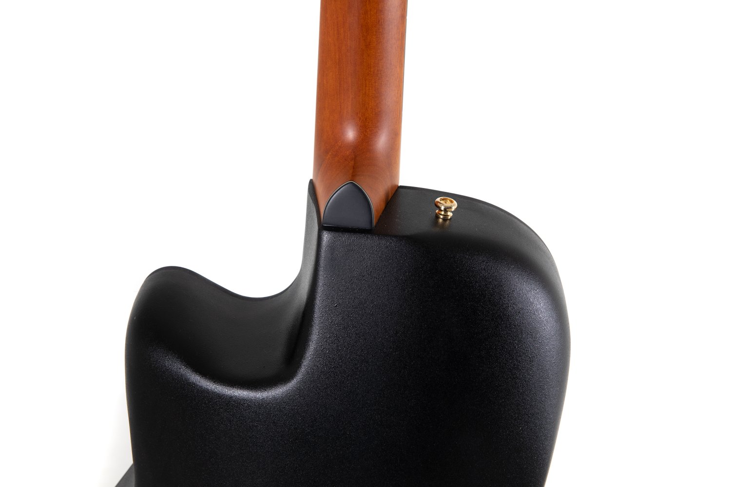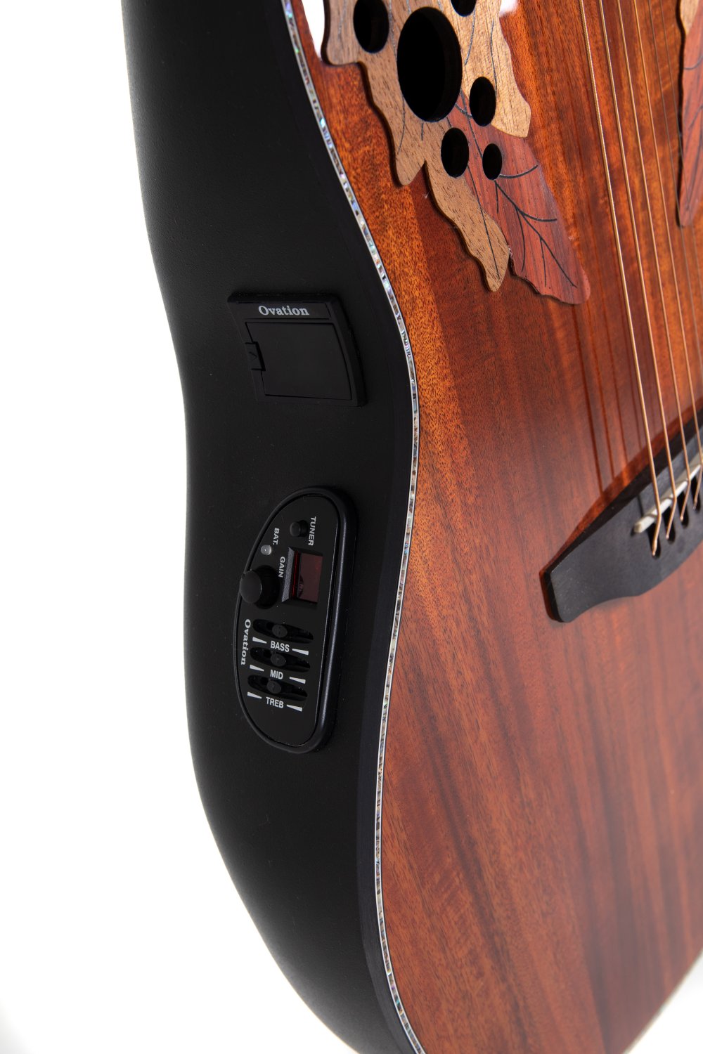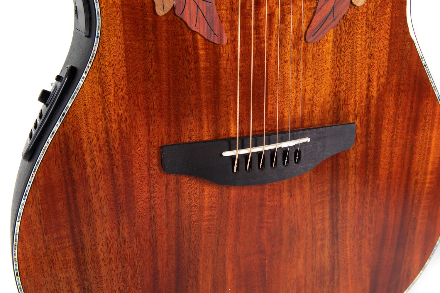 Selected figured top scalloped, quarter sawn X-bracingMulti sound holeMid-depth Lyrachord® bodyNato neck, Ovangkol fingerboard and bridgeScale 642 mm, nut width 42,8 mmMulti hardwood epaulettesAbalone-Dot-InlaysBlack binding with Abalone purflingDie-cast Ovation machine headsOvation slimline pickup, OP4BT preamp with tunerGold Ovation logo and hardwareItem Code: CE44P-FKOA